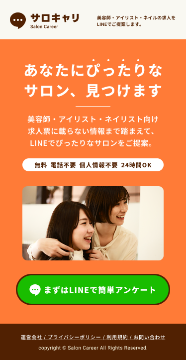 LINEで気軽に相談するだけで、求人情報だけではわからないサロンの雰囲気や教育方針まで加味した「あなたに本当に合うサロン」を提案。24時間いつでも相談可能で、応募後のやりとりや入社までのサポートも専門スタッフが支援します。