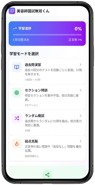 過去問の演習に加え、分野別特訓モードや弱点克服モード、模擬試験形式の問題演習など、自分のペースと苦手分野に合わせて対策を進められます。スマホやPCからアクセス可能で、基礎から実践まで段階的に学習できます。